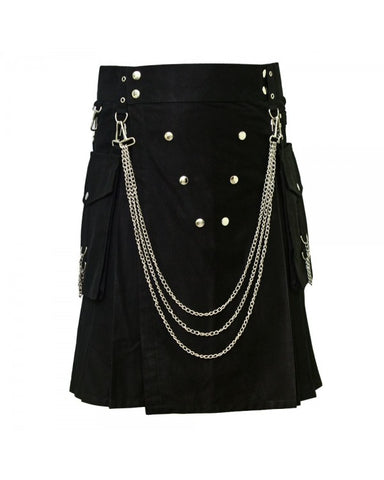 Black Front Button Detachable Pocket Chrome Chain Cotton Kilt